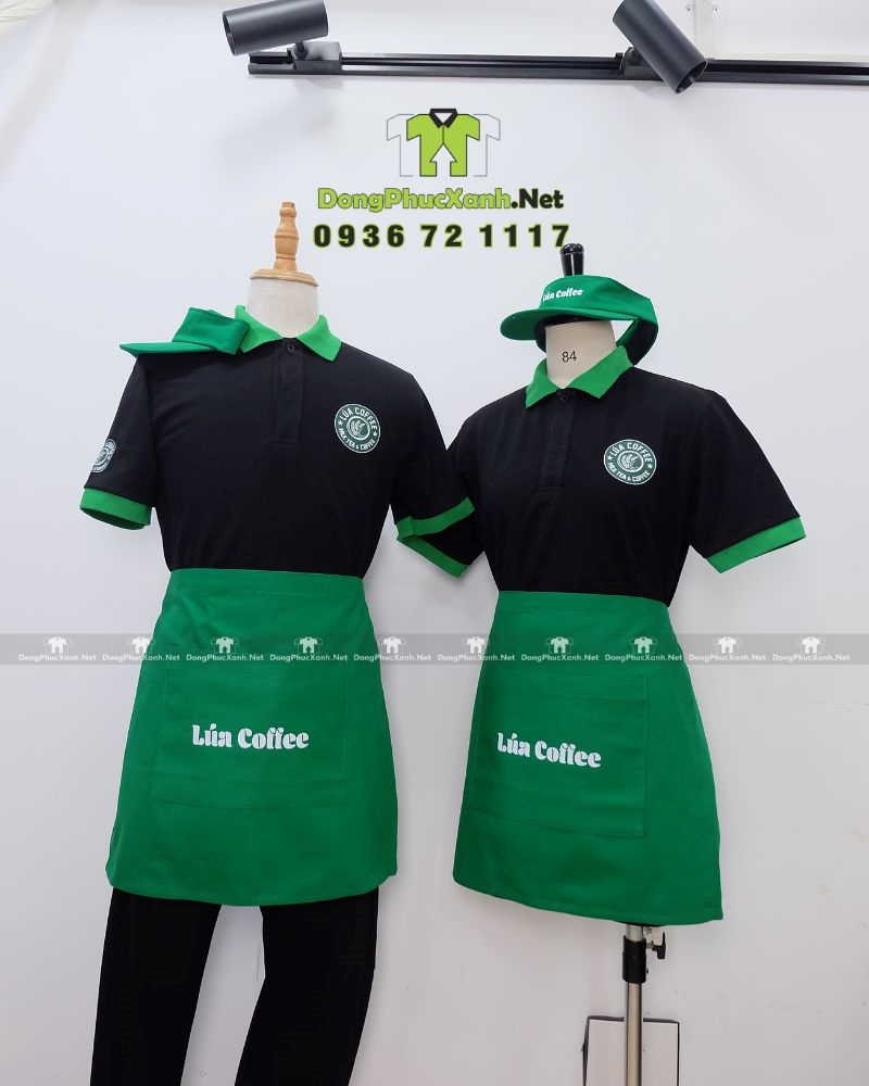 Đồng phục quán cafe là yếu tố quan trọng giúp tạo dấu ấn thương hiệu và nâng cao hình ảnh chuyên nghiệp trong không gian phục vụ. Sự kết hợp giữa áo polo, tạp dề và nón mang lại tổng thể đồng bộ, gọn gàng và dễ nhận diện. Logo Lúa Coffee được in rõ nét, góp phần tạo ấn tượng thương hiệu và tăng tính chuyên nghiệp cho đội ngũ nhân viên.