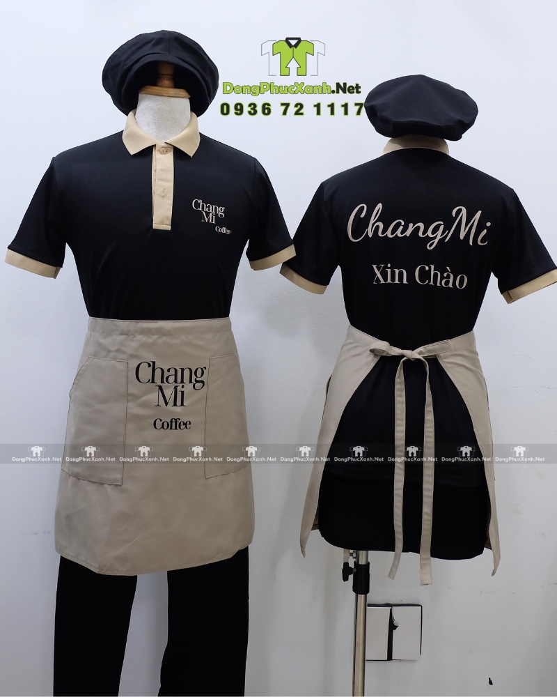 Mẫu đồng phục quán cafe đẹp là yếu tố quan trọng giúp xây dựng hình ảnh chuyên nghiệp và tạo dấu ấn thương hiệu trong không gian phục vụ. Sự kết hợp giữa áo polo và tạp dề mang lại tổng thể gọn gàng, dễ nhận diện và tiện lợi khi làm việc. Logo Chang Mi Coffee được in tinh tế, góp phần tạo sự đồng bộ và nâng cao hình ảnh quán trong mắt khách hàng.
