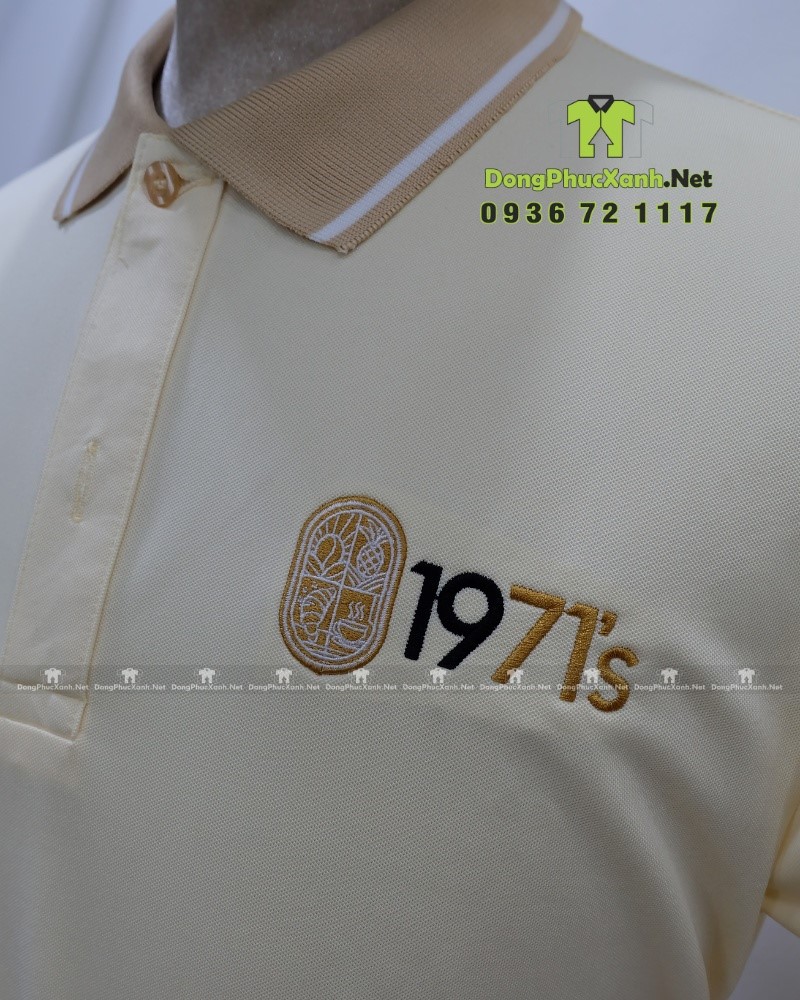 Mẫu đồng phục nổi bật với áo vàng nhạt phối viền nâu, kết hợp tạp dề và nón màu be, thêu logo 1971’s màu đen – vàng sang trọng, mang đến sự hài hòa và ấn tượng.