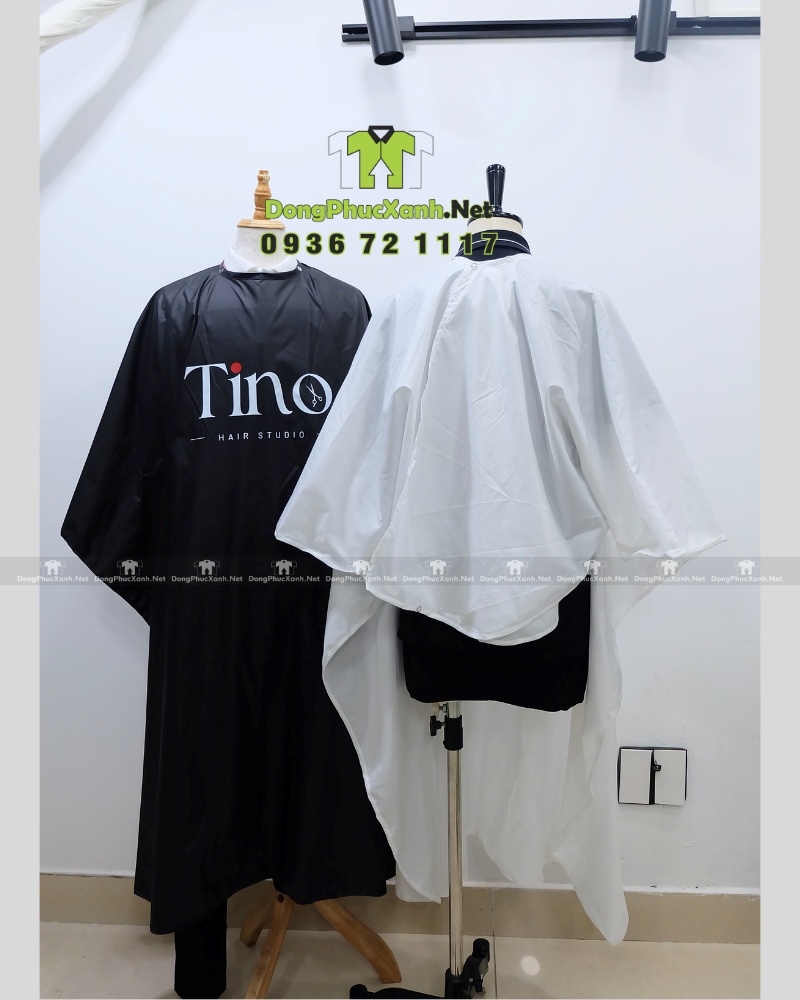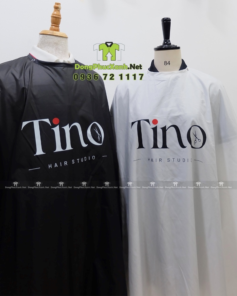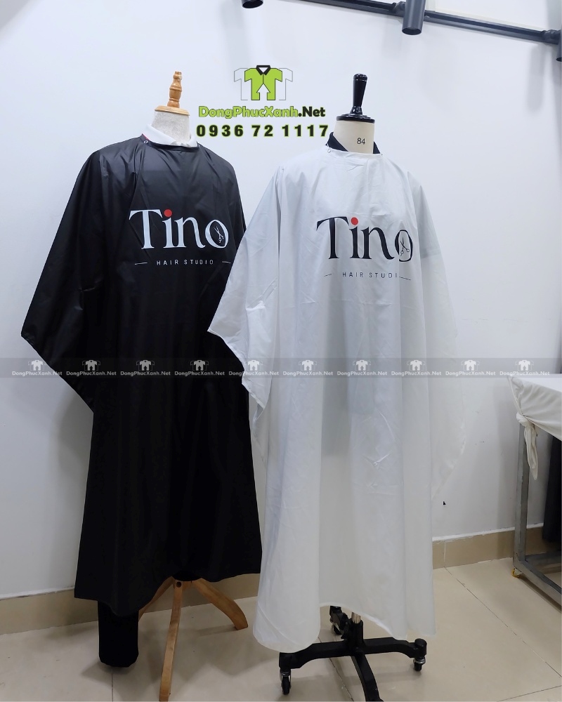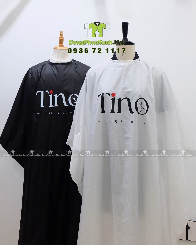Áo choàng tóc in logo Tino giúp bảo vệ quần áo khách hàng khi cắt, gội, nhuộm, đồng thời nâng cao sự chuyên nghiệp và hình ảnh thương hiệu salon.