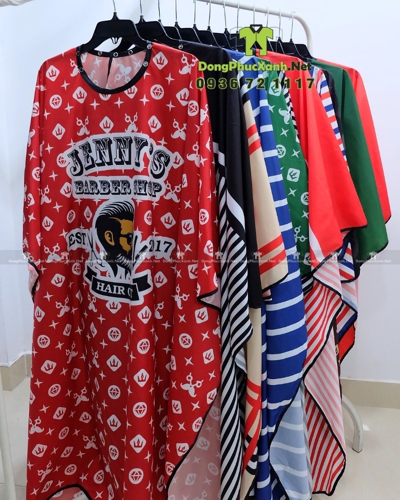 Áo choàng tóc in logo giúp bảo vệ quần áo khách hàng khỏi tóc vụn, hóa chất và đồng thời tạo nên hình ảnh chuyên nghiệp, đồng bộ cho salon và barber shop.