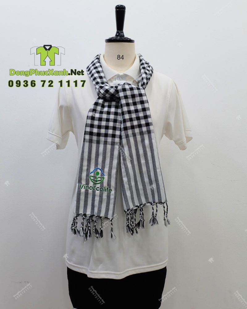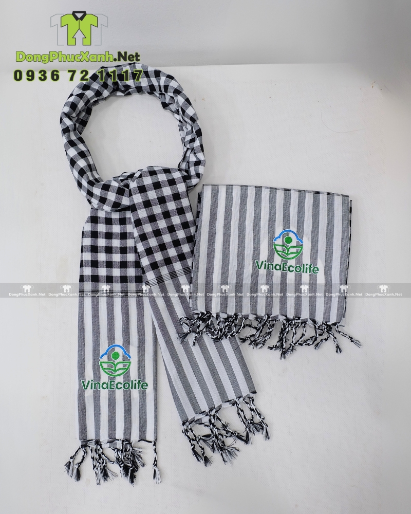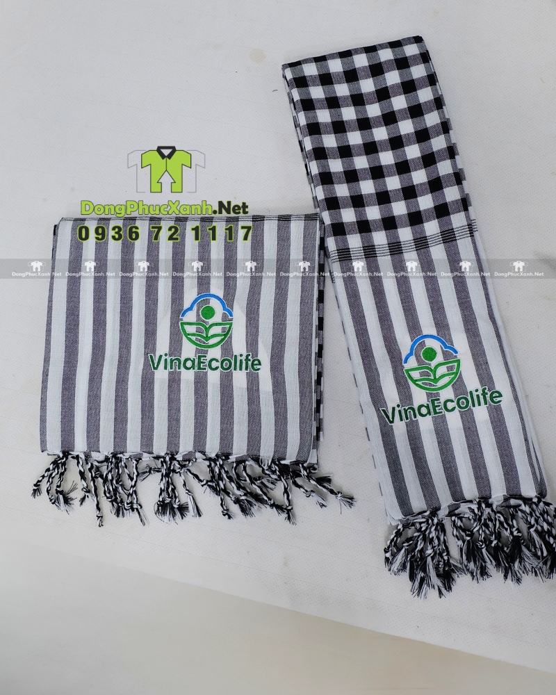 Khăn rằn đồng phục VinaEcolife được thiết kế dạng hình chữ nhật, có thể gấp gọn khi sử dụng hoặc trưng bày. Sản phẩm phù hợp làm phụ kiện nhận diện hoặc quà tặng trong các chương trình truyền thông.