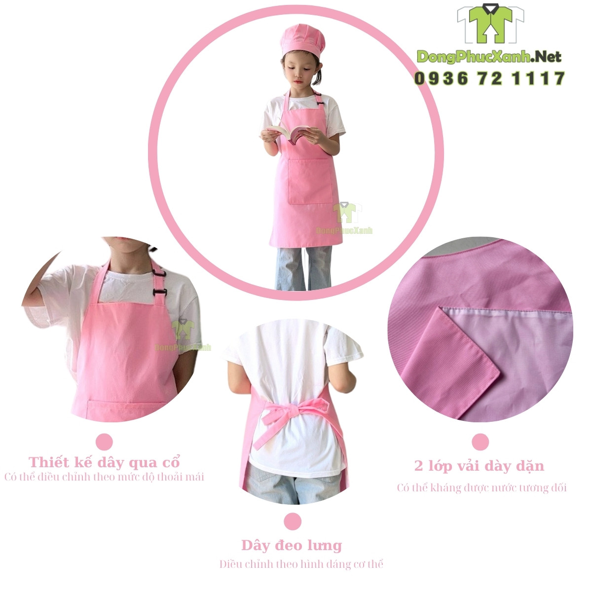 Sản phẩm được may từ vải kaki 65 dày dặn, đứng form, bền chắc nhưng vẫn thoáng mát và dễ giặt sạch. Chất vải hạn chế bám bẩn, nhanh khô, phù hợp cho bé sử dụng thường xuyên trong các hoạt động dễ dính màu vẽ, bột hay thực phẩm. Thiết kế tạp dề 2 lớp giúp tăng khả năng bảo vệ quần áo bên trong, hạn chế thấm màu và vết bẩn khi bé học vẽ hoặc làm bánh.