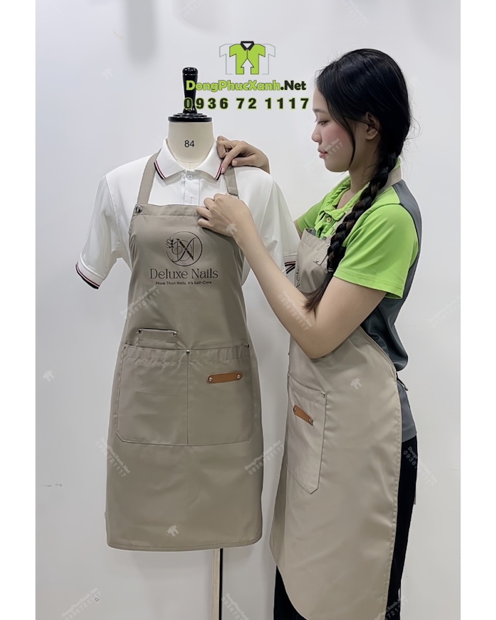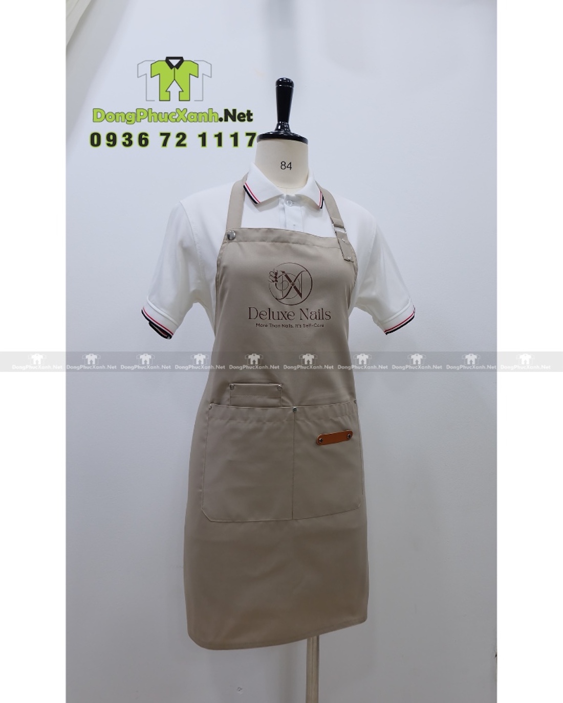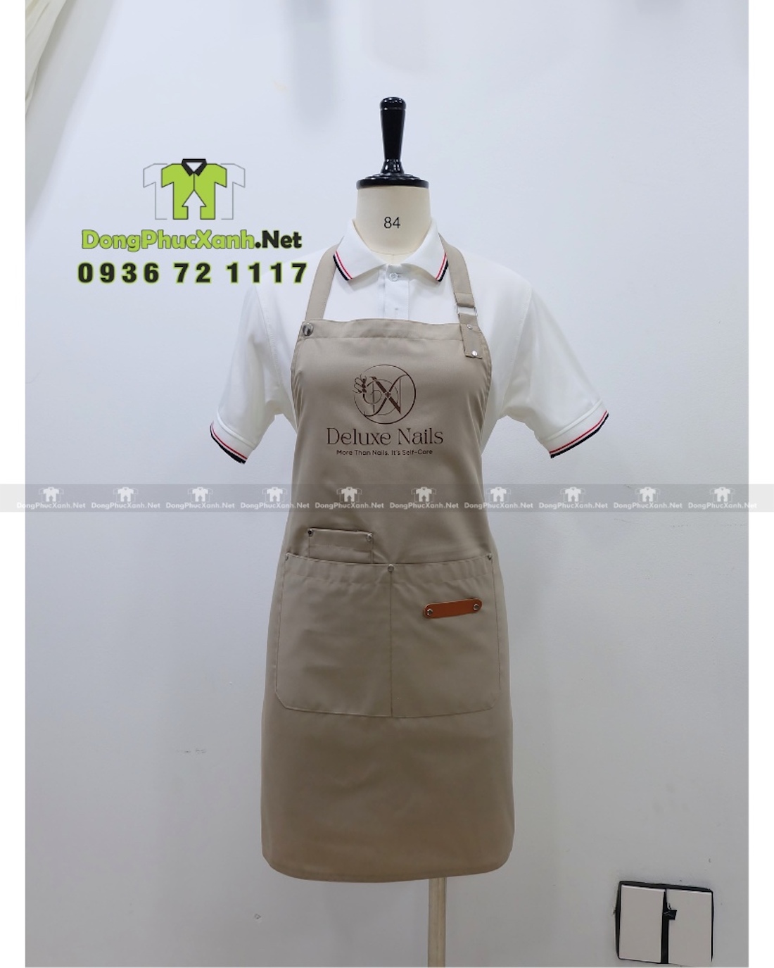 Với kiểu dáng tiện dụng và logo in nổi bật, tạp dề mang lại sự đồng bộ và nhận diện thương hiệu hiệu quả cho tiệm nail.