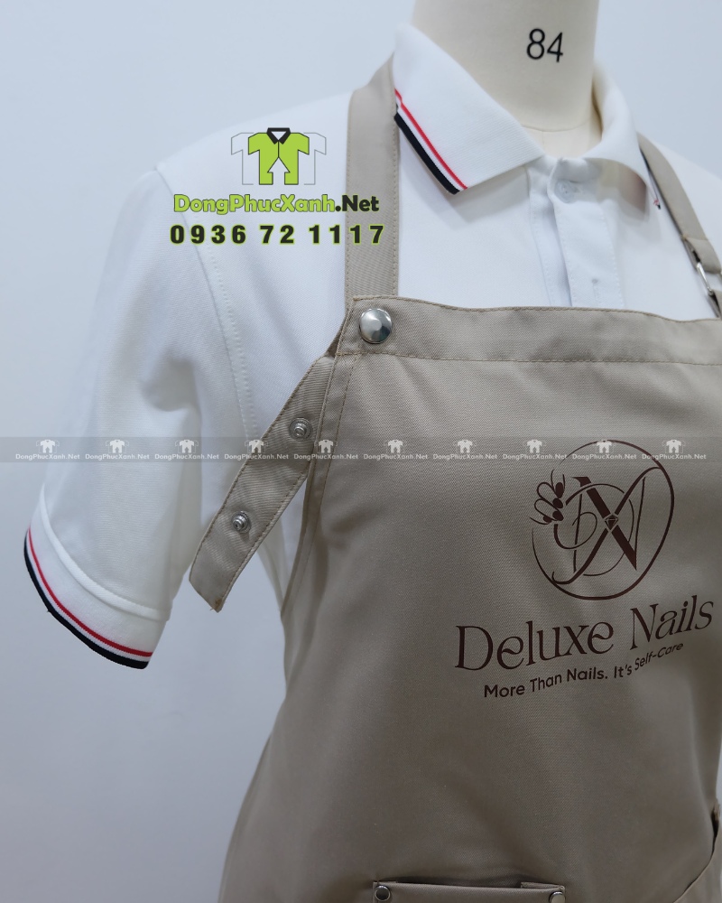 Tạp dề nail Deluxe Nails được thiết kế hiện đại, tinh tế, giúp nhân viên tiệm nail trở nên chuyên nghiệp và gọn gàng hơn. Sản phẩm vừa bảo vệ quần áo khỏi bụi bẩn, vừa nâng cao hình ảnh thương hiệu trong mắt khách hàng.