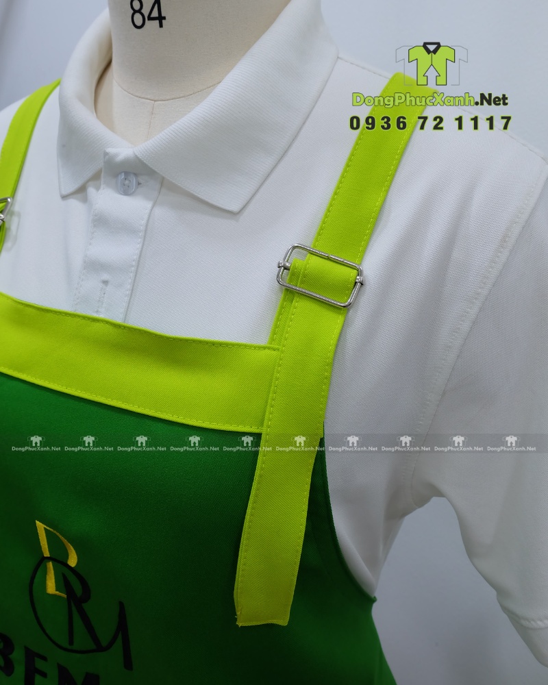 Mẫu tạp dề nổi bật với tông xanh lá phối xanh neon, logo thêu Bemay Salon màu đen sang trọng, mang đến sự trẻ trung và nổi bật cho tiệm.