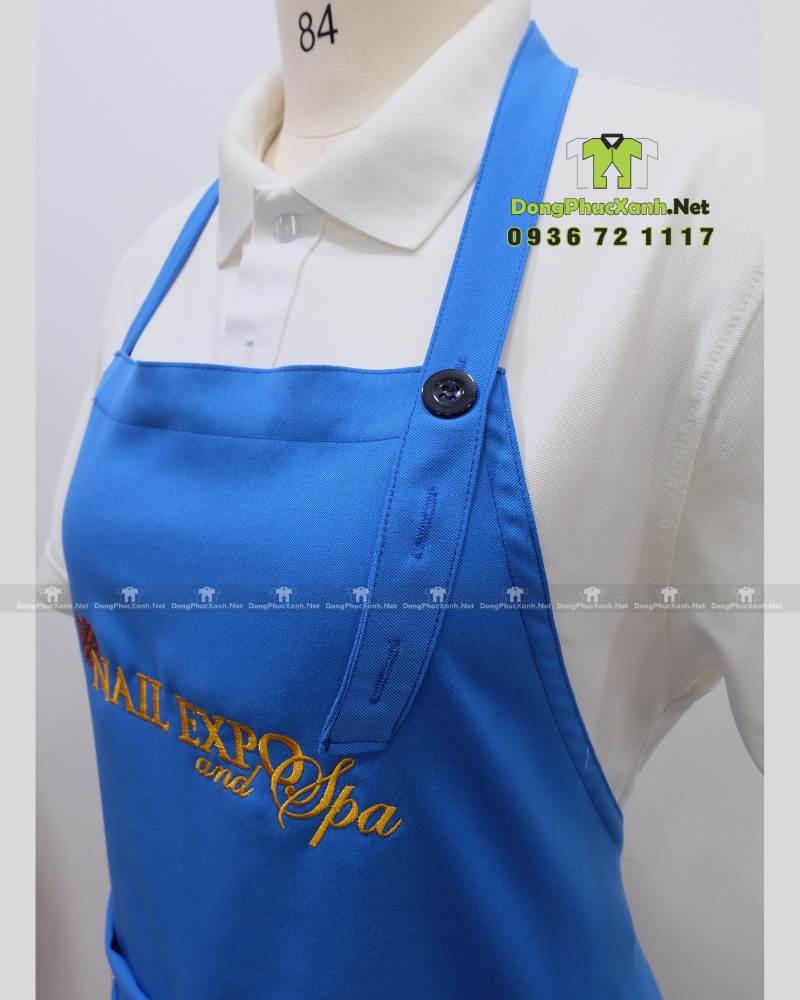 Mẫu tạp dề nail thêu logo Nail Expo and Spa được thiết kế theo phong cách tươi sáng và chuyên nghiệp, phù hợp với không gian làm đẹp hiện đại.