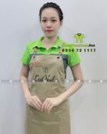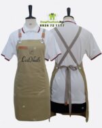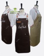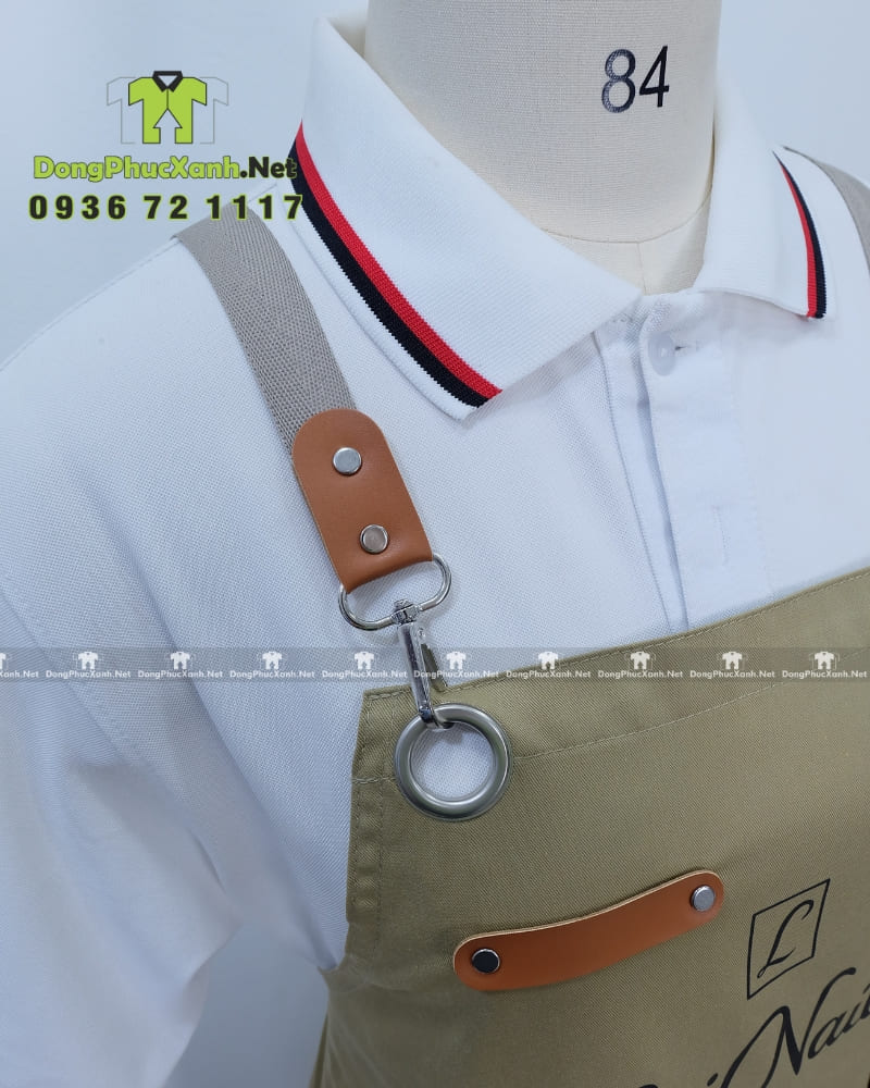 Điểm nổi bật của sản phẩm nằm ở hệ thống dây đeo chéo chữ H qua vai, được phối cùng miếng da bò nâu thật và khóa inox tròn bóng cao cấp. Toàn bộ chi tiết phần trên của tạp dề được xử lý tỉ mỉ, tạo nên vẻ ngoài tinh tế và đẳng cấp khi nhân viên khoác lên người. Logo tiệm được in sắc nét ngay phần thân chính, trở thành điểm nhận diện thương hiệu nổi bật và chuyên nghiệp trong mắt khách hàng.