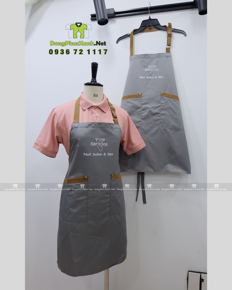 Chi tiết sản xuất Tạp dề nail màu xám nhạt in logo Top Service thiết kế vừa vặn, chắc chắn.