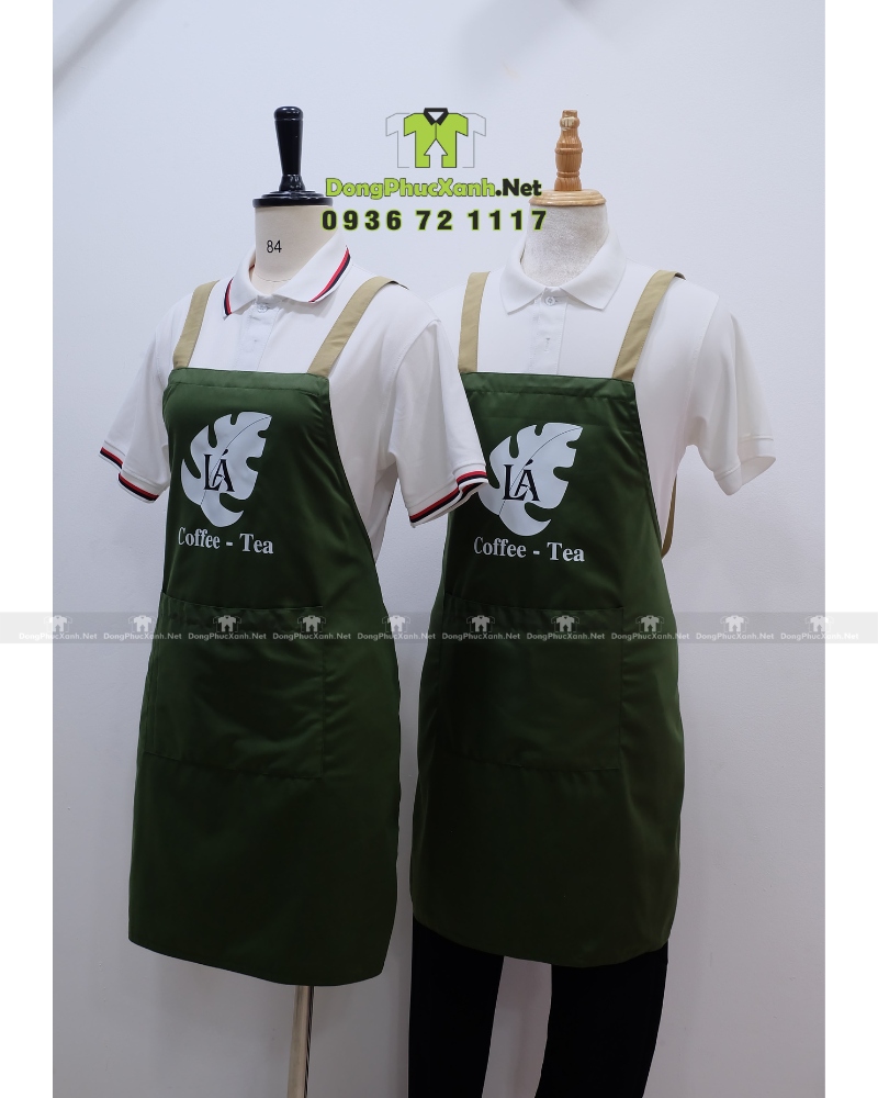 Mẫu tạp dề có tông xanh rêu phối dây be nổi bật, đồng điệu với phong cách thương hiệu Lá Coffee – Tea.