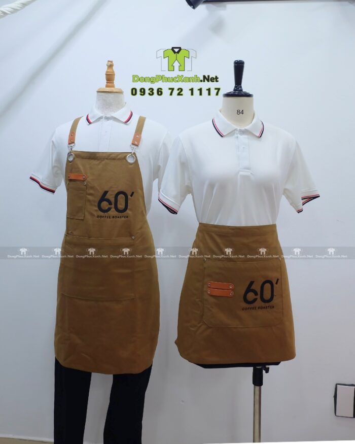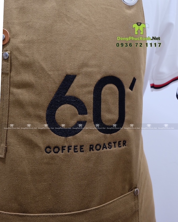 Mẫu tạp dề pha chế thêu logo 60′ Coffee Roaster mang đến sự đồng bộ, vừa bảo vệ quần áo, vừa khẳng định phong cách thương hiệu.