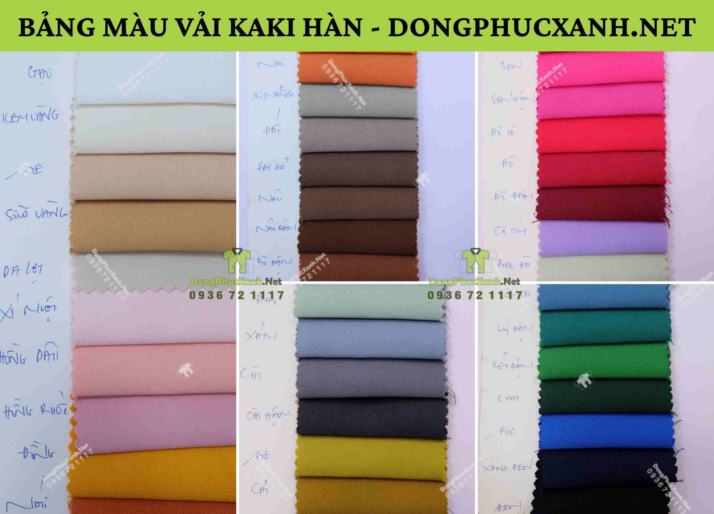 Ngoài ra, quý khách hàng có thể lựa chọn thêm màu sắc dựa trên bảng màu vải Kaki hàn mà DongPhucXanh.Net cung cấp ở dưới đây: