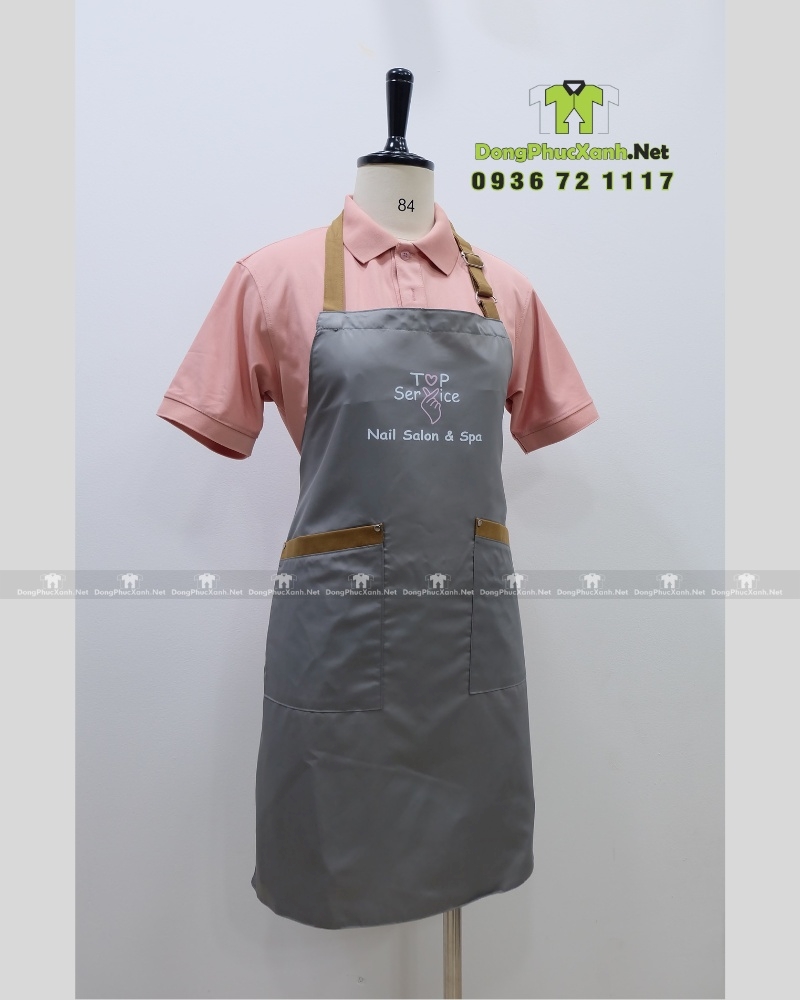 • Tạp dề nail màu xám: trung tính, hiện đại, phù hợp với tiệm theo phong cách tối giản.