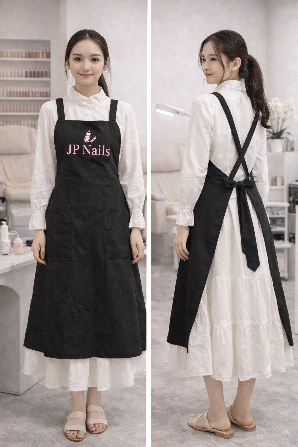 • Form dáng: Kiểu dáng yếm (Bib Apron) che phủ toàn diện từ ngực đến đầu gối, bảo vệ thợ nail khỏi bụi mài móng, nước sơn và hóa chất.